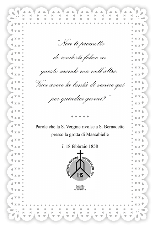 Santino con ricamo modello Galilea a taglio laser con personalizzazione completa fronte sia dell’immagine, sia della preghiera.