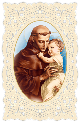 Santino con ricamo modello Hebron a taglio laser con personalizzazione completa fronte sia dell’immagine, sia della preghiera.